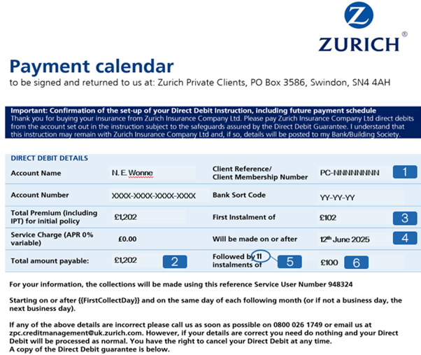 Exempt from the CCA and not subject to FCA authorisation. Whilst the credit agreement is not regulated, Zurich remains regulated by the FCA and has responsibilities under Consumer Duty to ensure your policy is fair value. We include consideration of the way you pay for your premium as part of that assessment. The ‘unfair relationships’ provisions in the CCA will also continue to apply. |